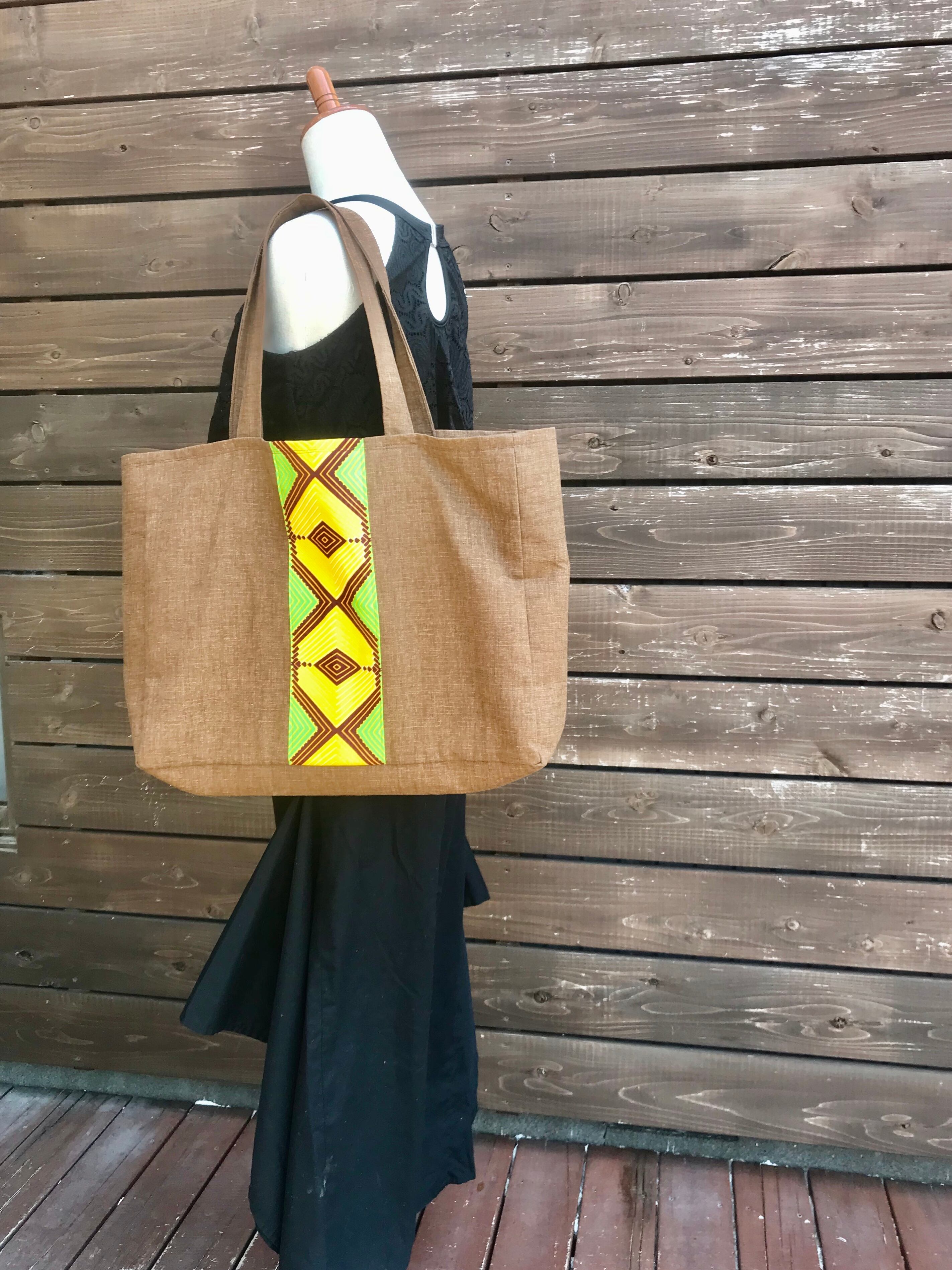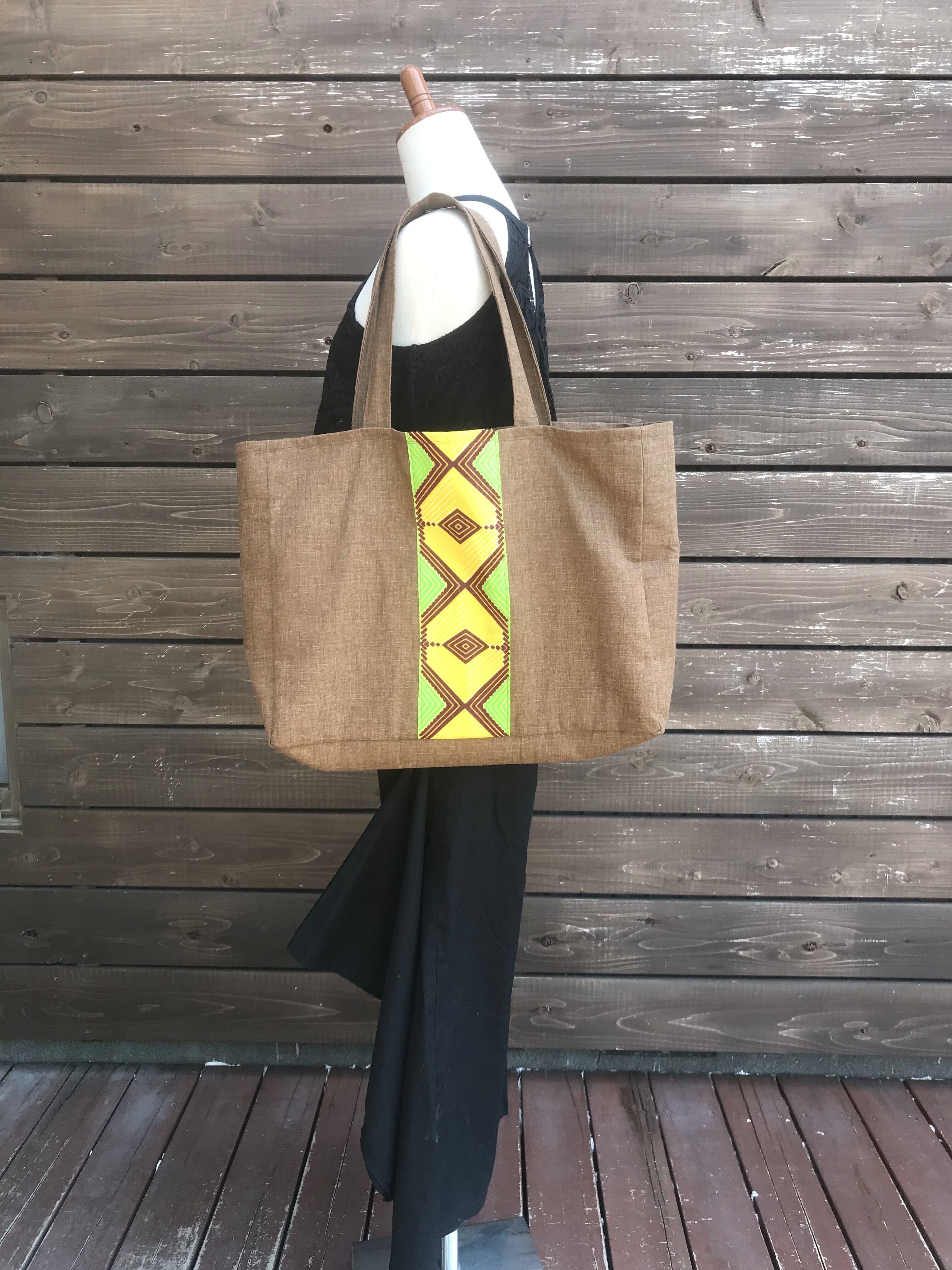 アフリカンプリント生地をセンターに部分使いした、トートバック。